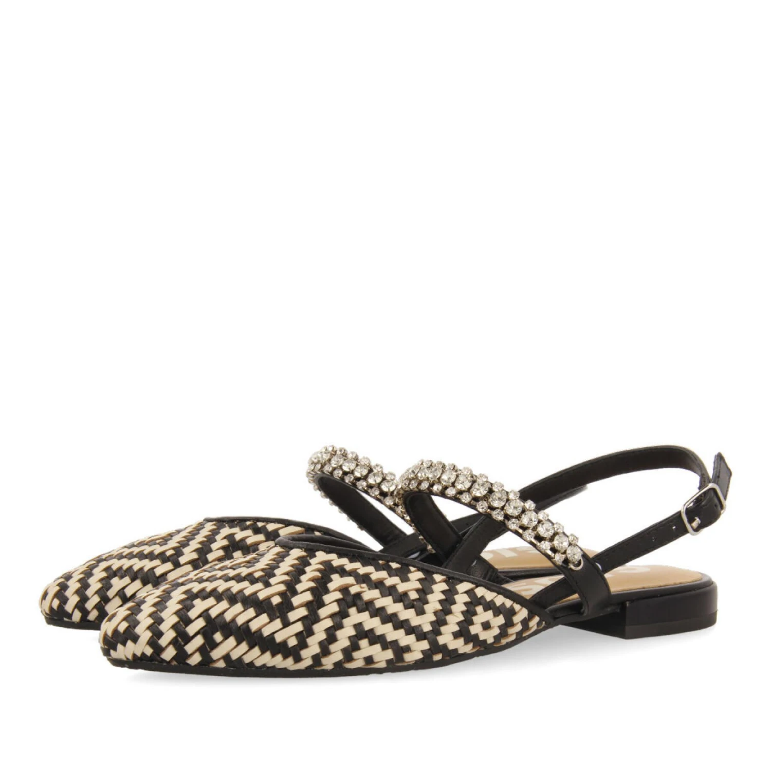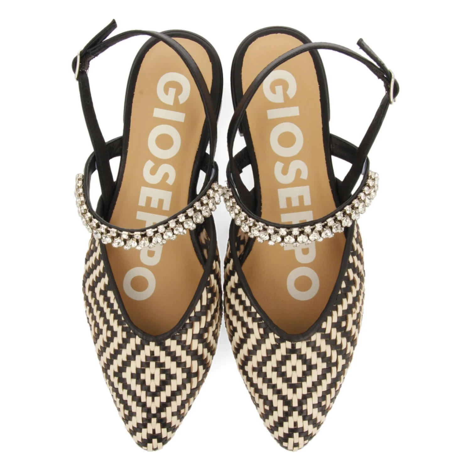 De etnische trend die dit seizoen zeker een buzz zal creëren. Ballerina pumps zonder hak met wit en zwart vlechtwerk en glitterversiering op de vamp. Glimmende zwarte hak. Verstelbare gesp. Sterk gewatteerde leren zool. Latex zool. Zeer flexibele zool. Ontdek alle modellen ballerina’s voor dit FW22 seizoen in de nieuwe Gioseppo Woman collectie.
