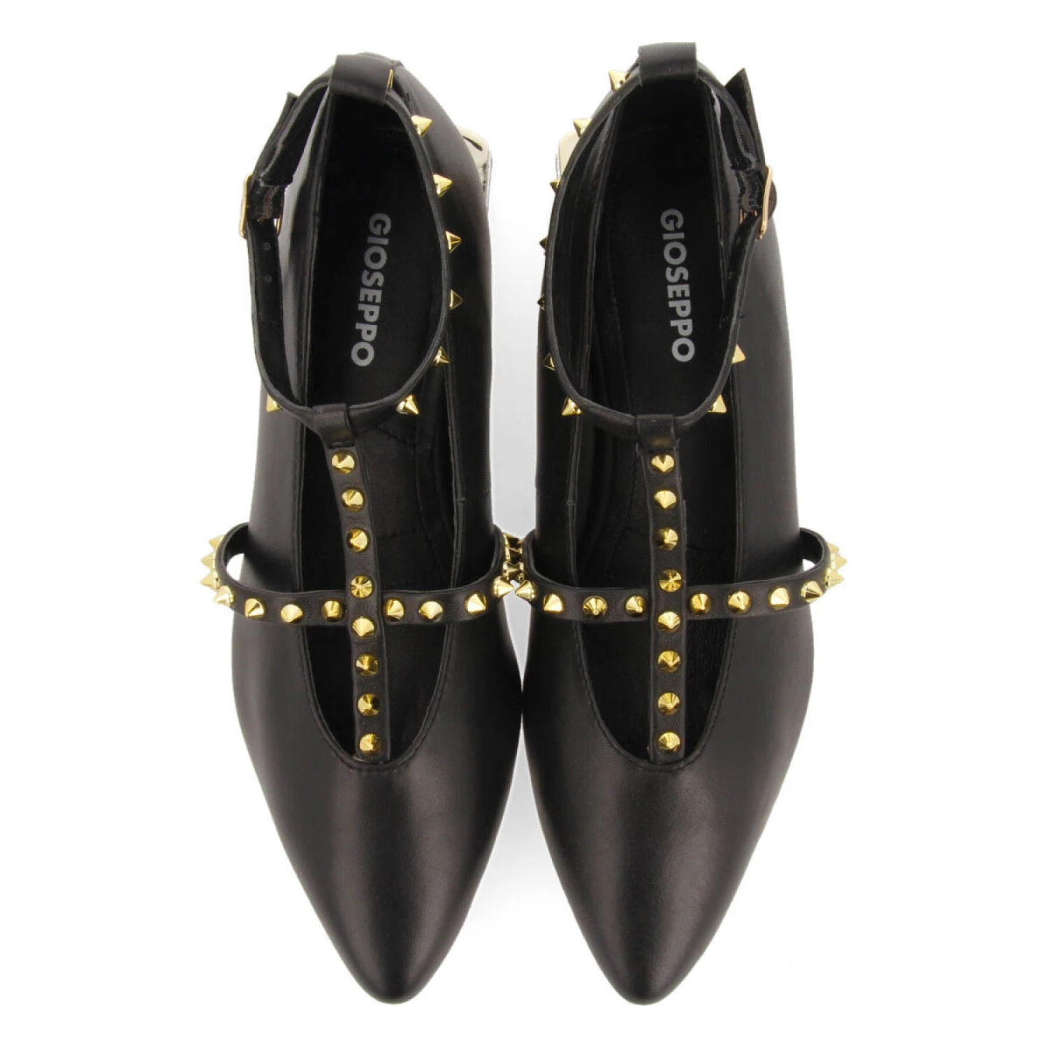 Het model dat je nodig hebt! Zwarte ballerina’s met slanke neus en bandjes versierd met ministopjes. Glanzende zwarte hak. Uitsparing, zool en voering van leer dat is gelooid met een duurzamer looiproces dat voldoet aan de normen van Leather Working Group. Zool met extra latex vulling voor meer comfort. Flexibele zool. Mis de nieuwe FW23 collectie ballerina’s van Gioseppo Woman niet.