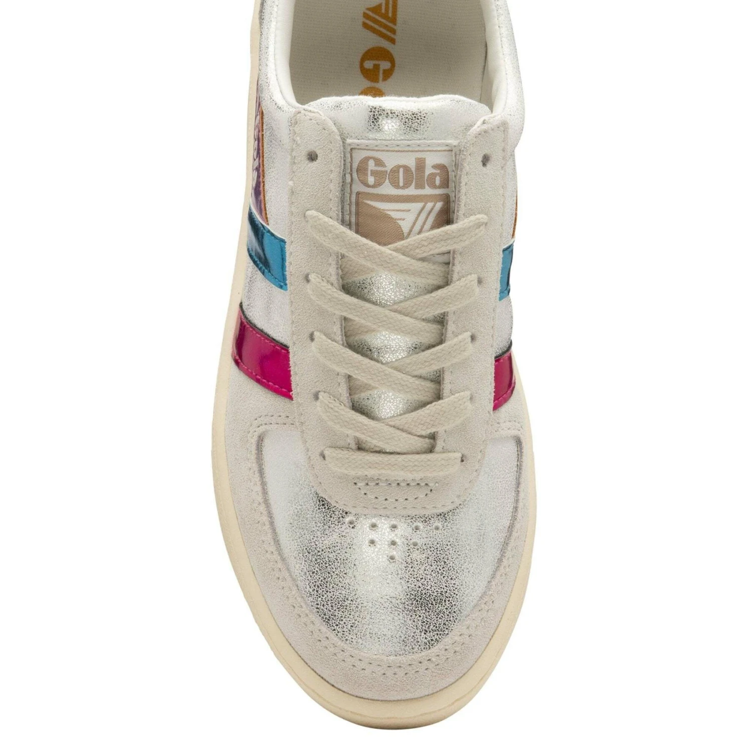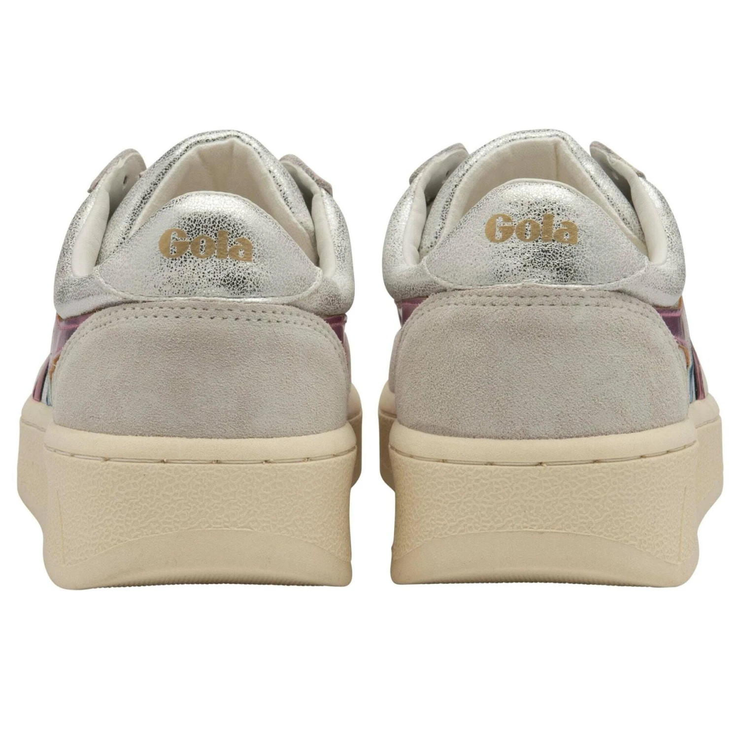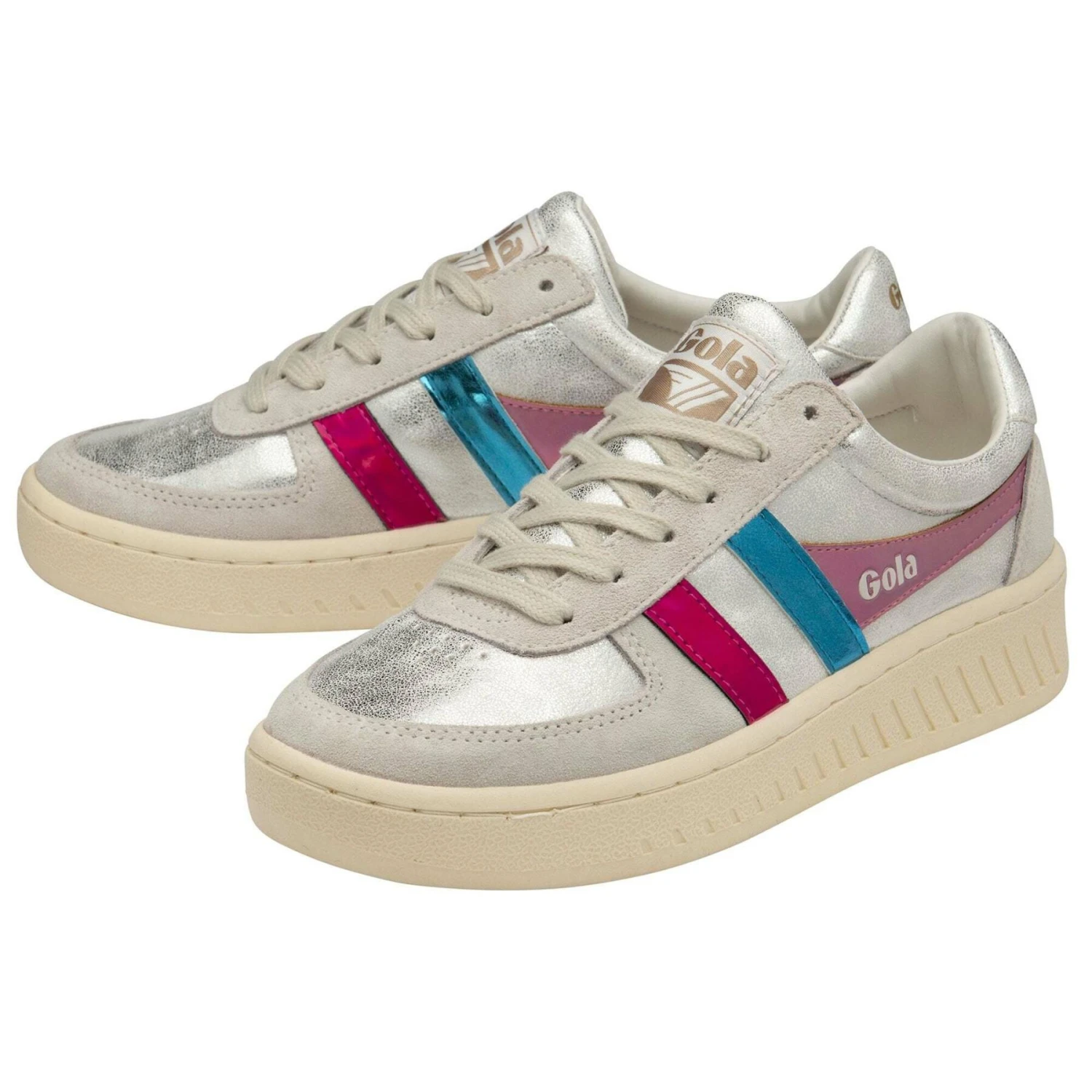 De Grandslam Shimmer Flare voor dames zijn dit seizoen het ultieme trainersstatement. Het Grandslam-silhouet van Gola wordt geaccentueerd met een bovenwerk van wit metallic en een opvallende gekleurde foliebies. Voeg daarbij alle verwijzingen naar het Gola Grandslam erfgoed en je hebt een geweldige sneaker.- Off-white metallic bovenwerk- Lichtgewicht zool- Gekleurde folie vin- Dames stijl- Klassieke court stijl.