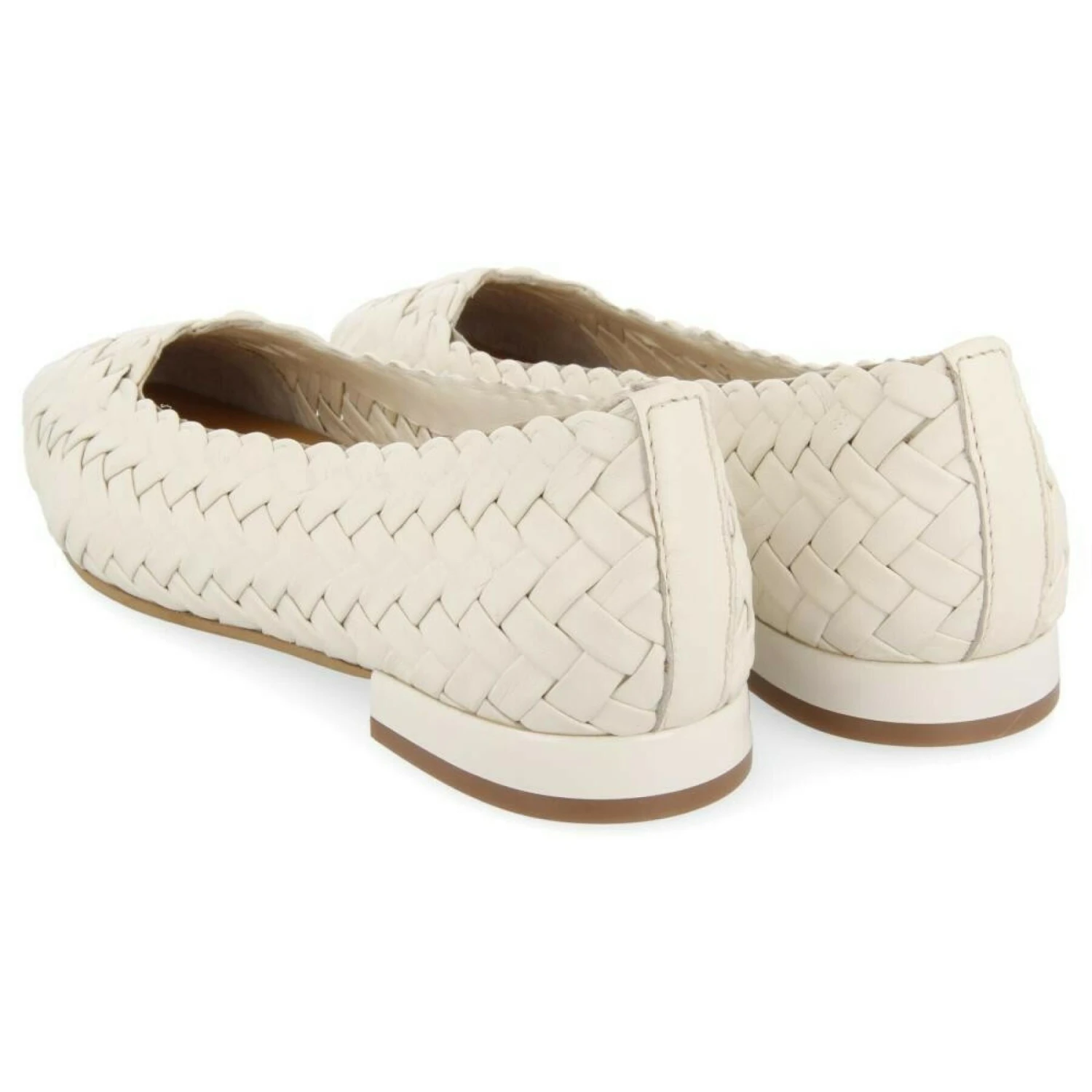 Off-white geweven lederen ballerina met semi-vierkante teen. Leren binnenzool met latex vulling. Zeer soepele zool voor maximaal comfort ! Mis het niet!