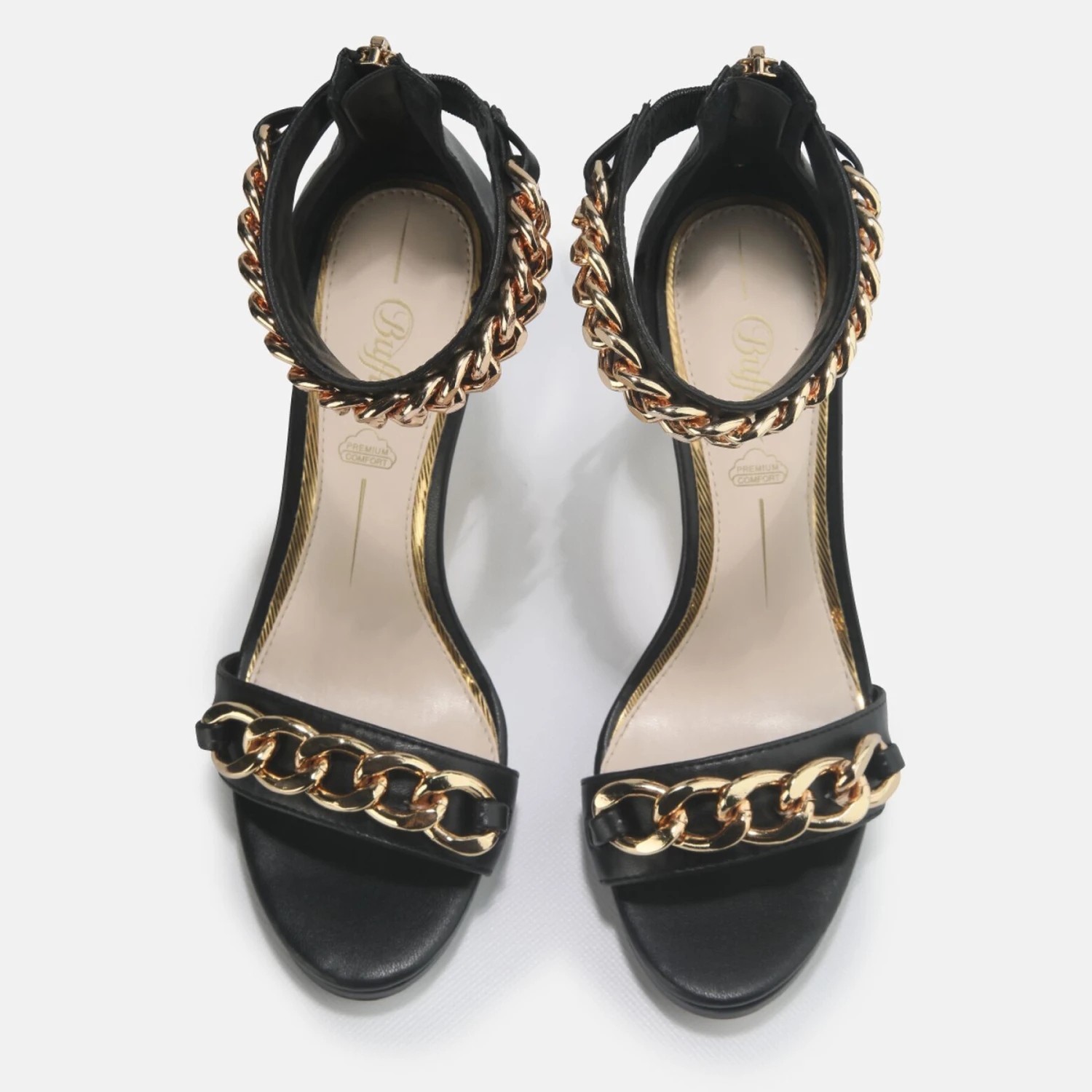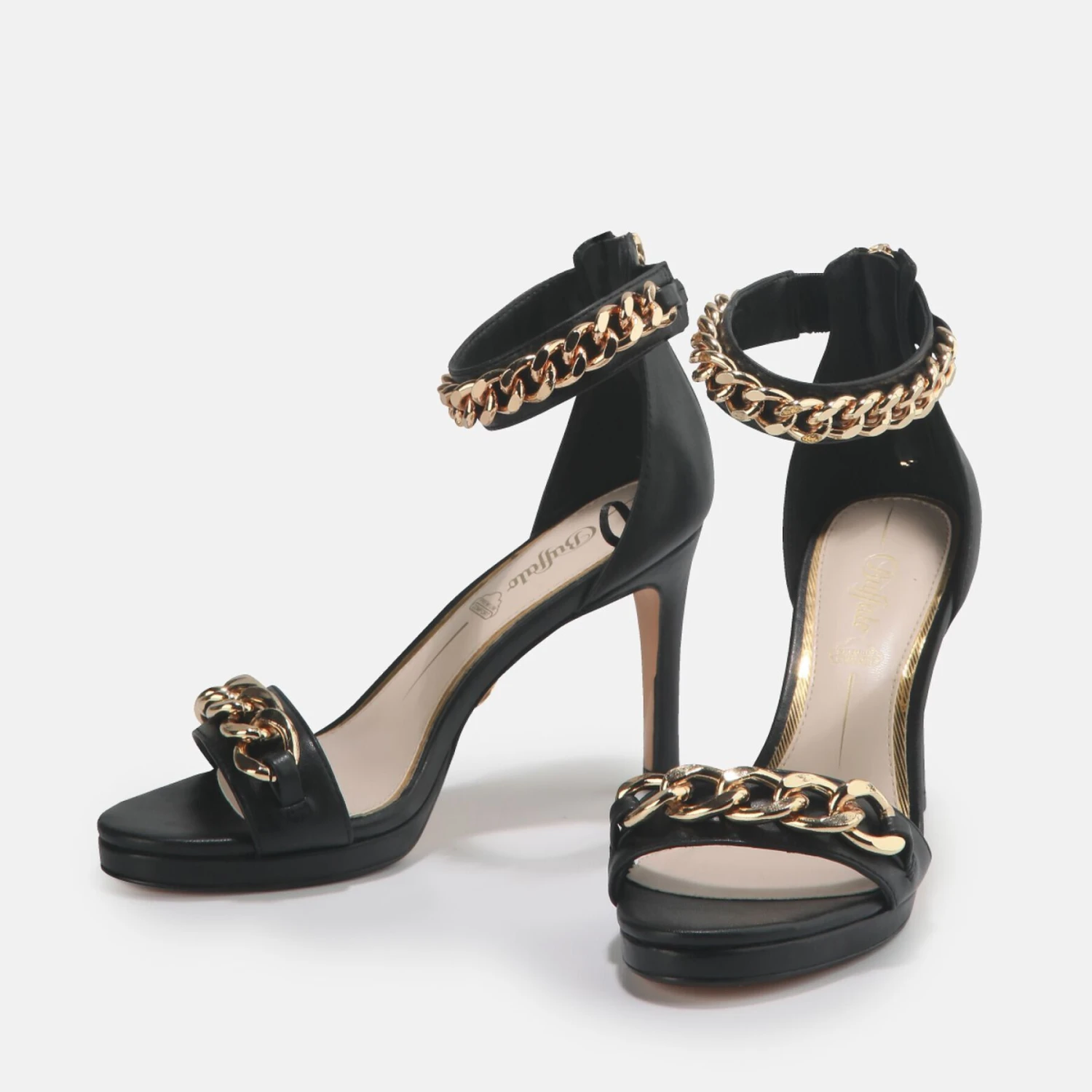 De sandalen met hak Serena Chain zullen een uniek stuk in uw schoenencollectie zijn! Het effen ontwerp maakt ze gemakkelijk te dragen. De gouden kettingen op de bandjes zijn een echte eye-catcher! Kenmerken:zwart nappalederVerstelbaar enkelbandje met gespsluiting9 cm naaldhakgouden kettingdetailsoptimaal comfort dankzij memory foam