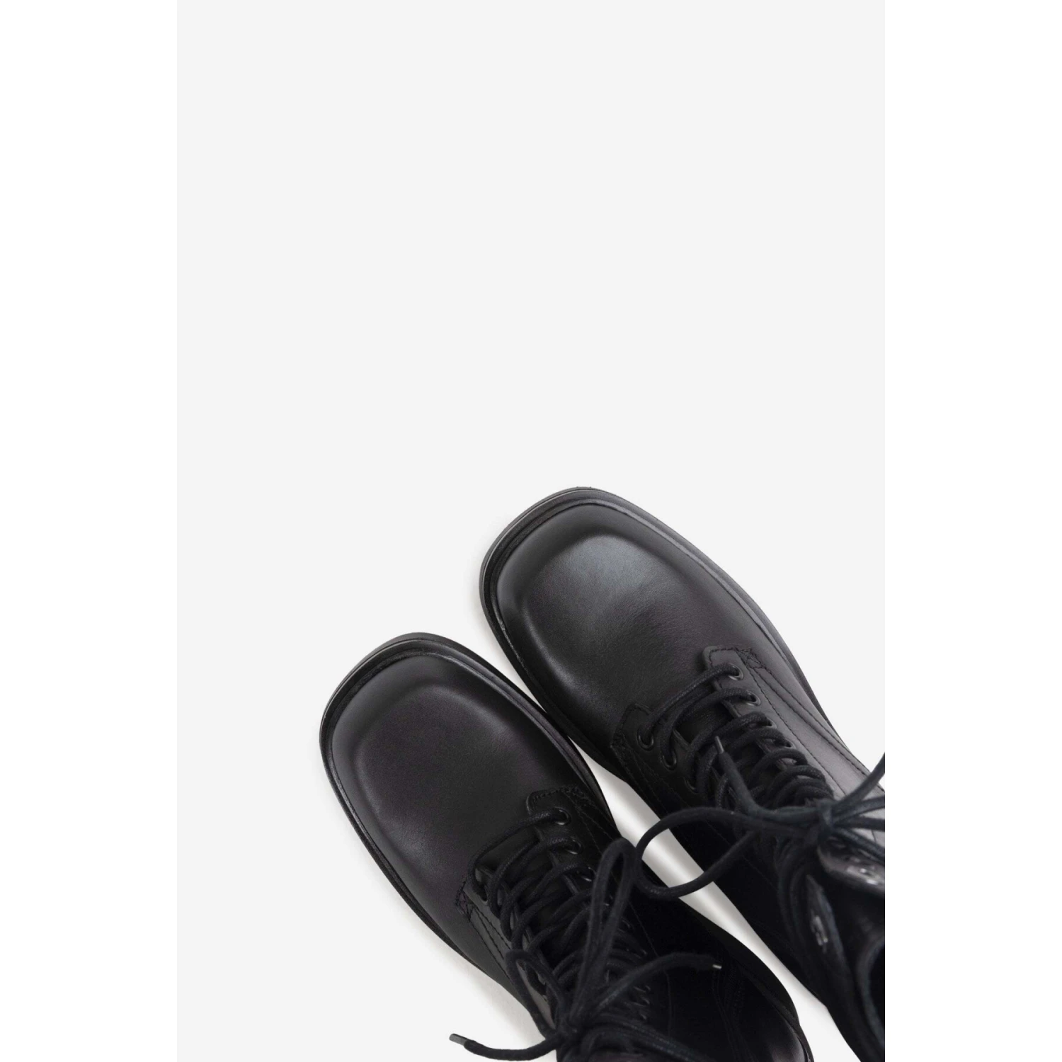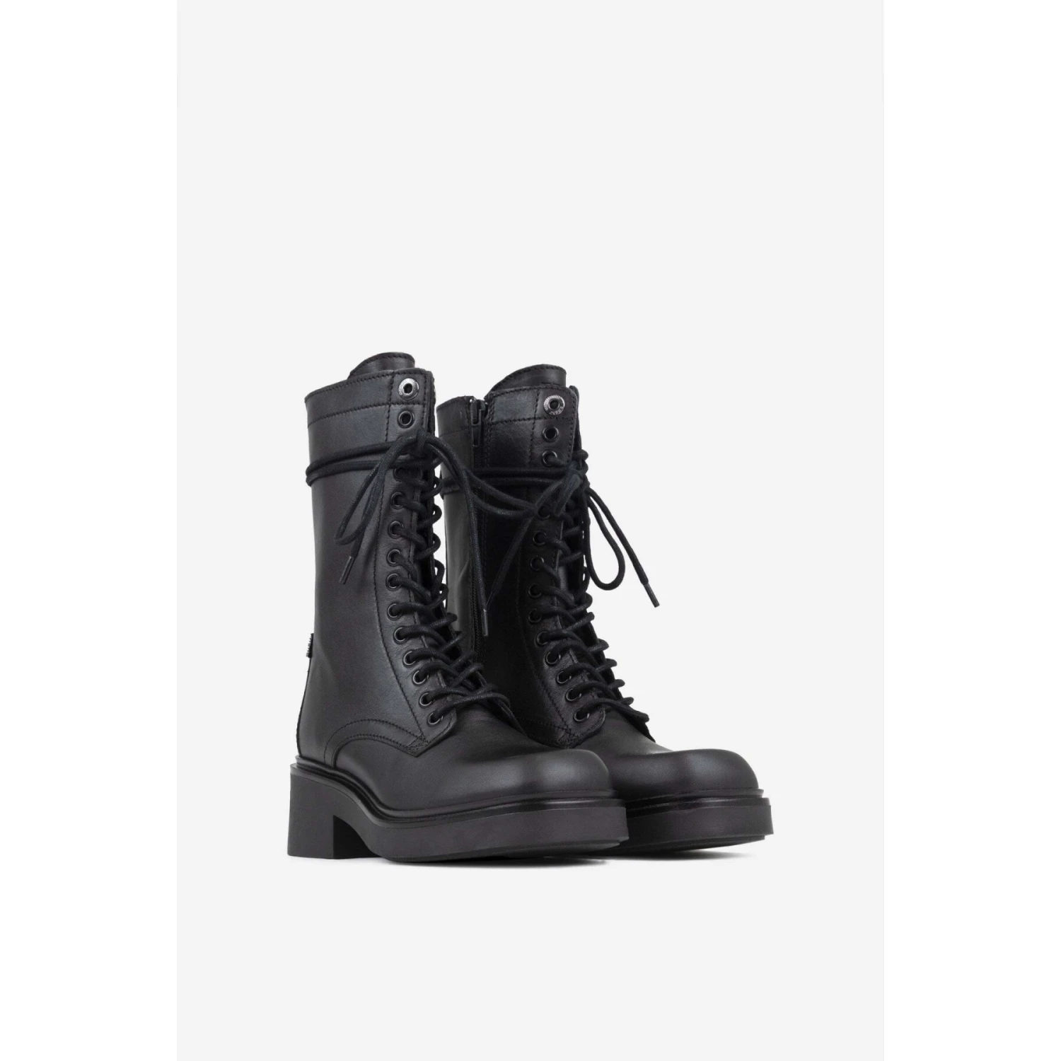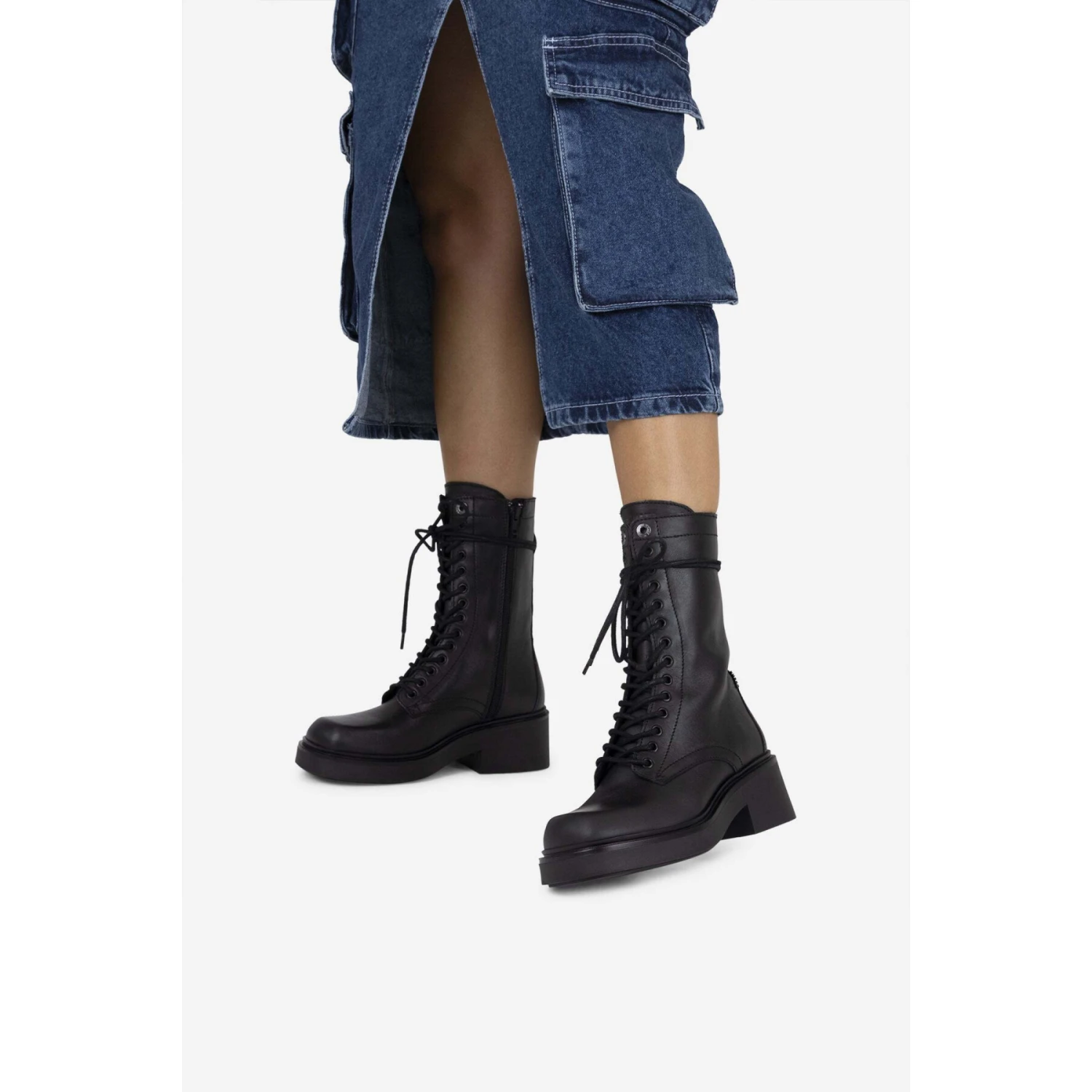 Het rijke tweekleurige geborstelde leer ondergaat een proces in drie fasen: van een gekleurde basis wordt er een zwarte laag overheen gelegd en met de hand afgewerkt om een tweekleurig effect van hoge kwaliteit te creëren. Het hybride ontwerp van deze laars Daff-ey is uniek in de modewereld.