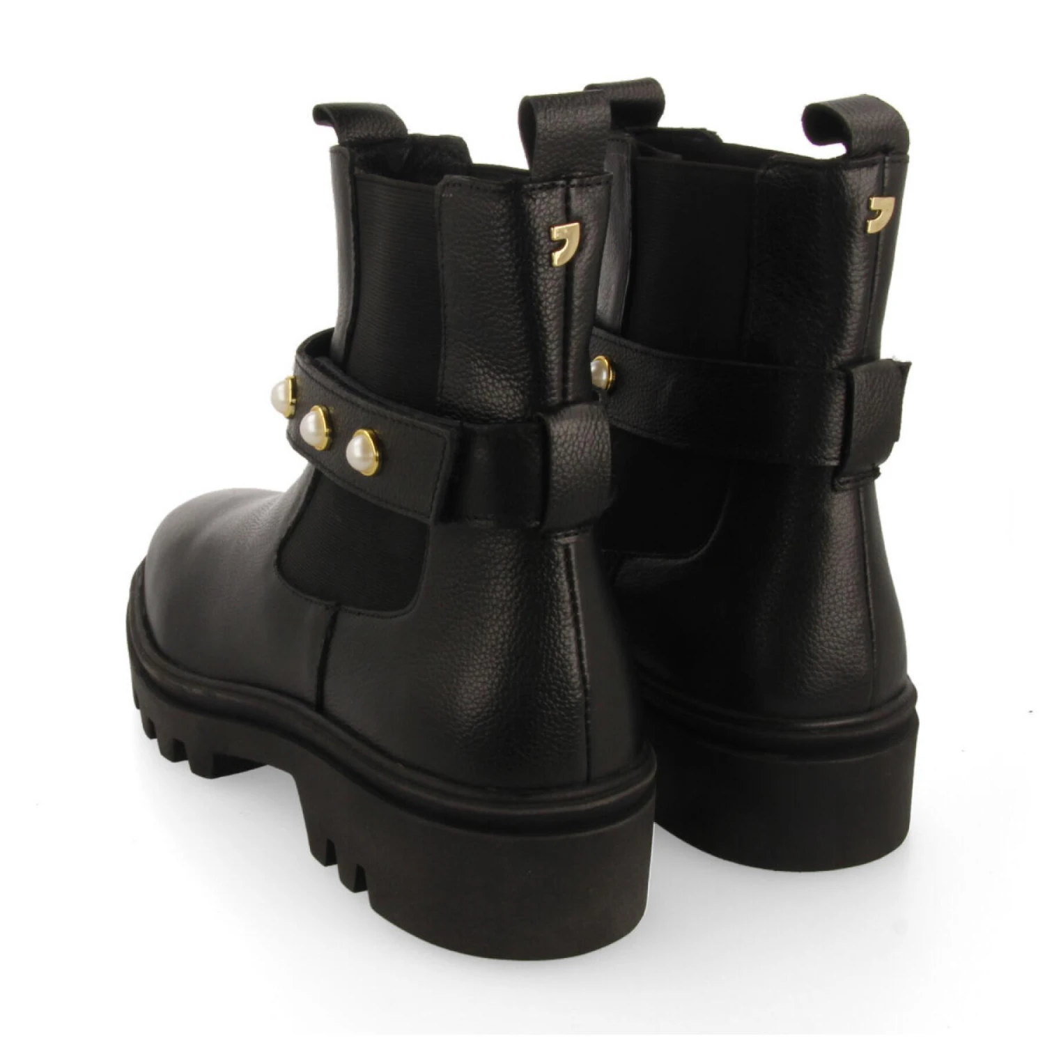 Het is tijd voor je debuut! Zwarte Chelsea laarzen met leren zolen. De sierband is versierd met maxiparels en een afneembare gesp. LWG leren binnenzolen en bovenstroken met latex coating. Voering van gerecycled polyester. Binnenzolen van natuurvezel en zolen van TPR-kurk.