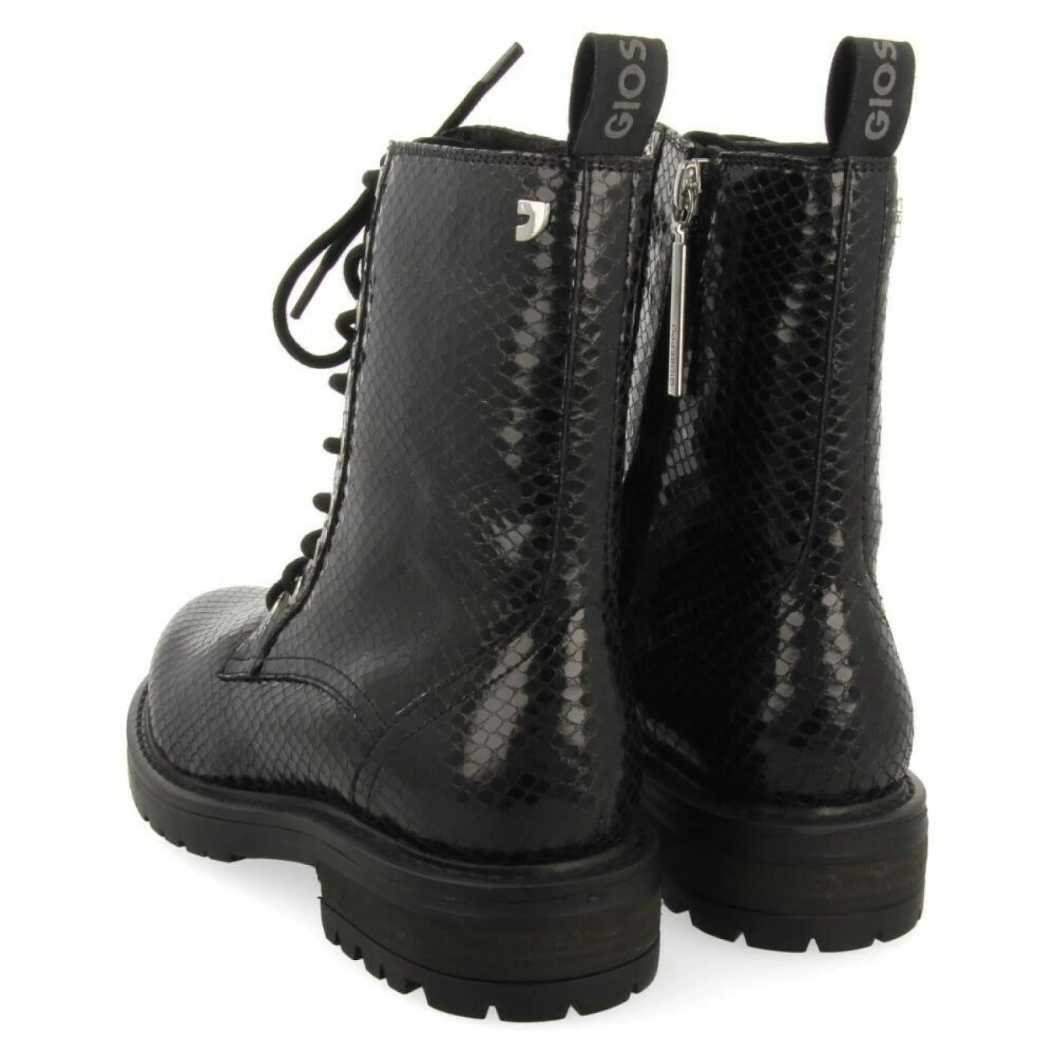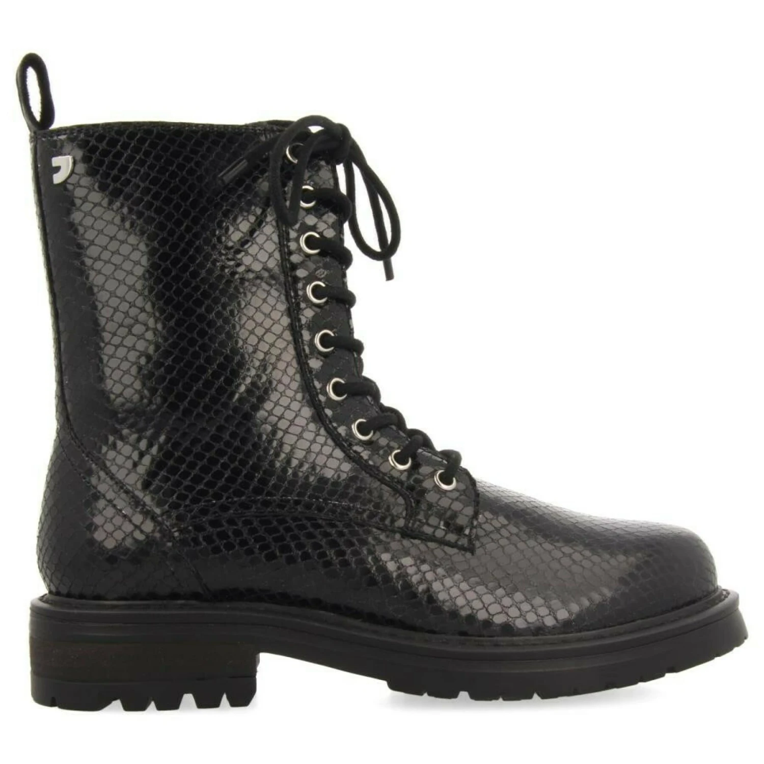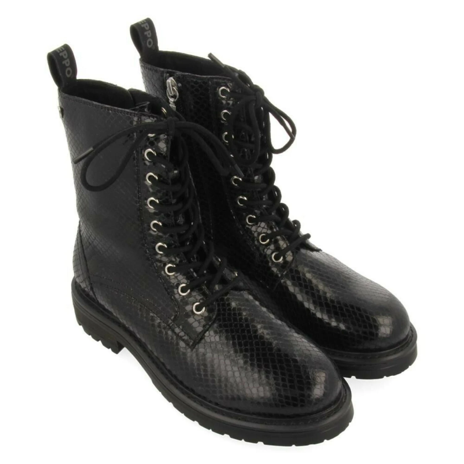 Een basic met een trendy twist. Zwart lederen combat stijl laarzen met slangenhuid print. Binnenzool van duurzaam leer met latex vulling. Binnenzool van duurzaam leer met latex vulling. Duurzaam leer en voering van gerecycled polyester. 3 cm zool. Onmogelijk te weerstaan.