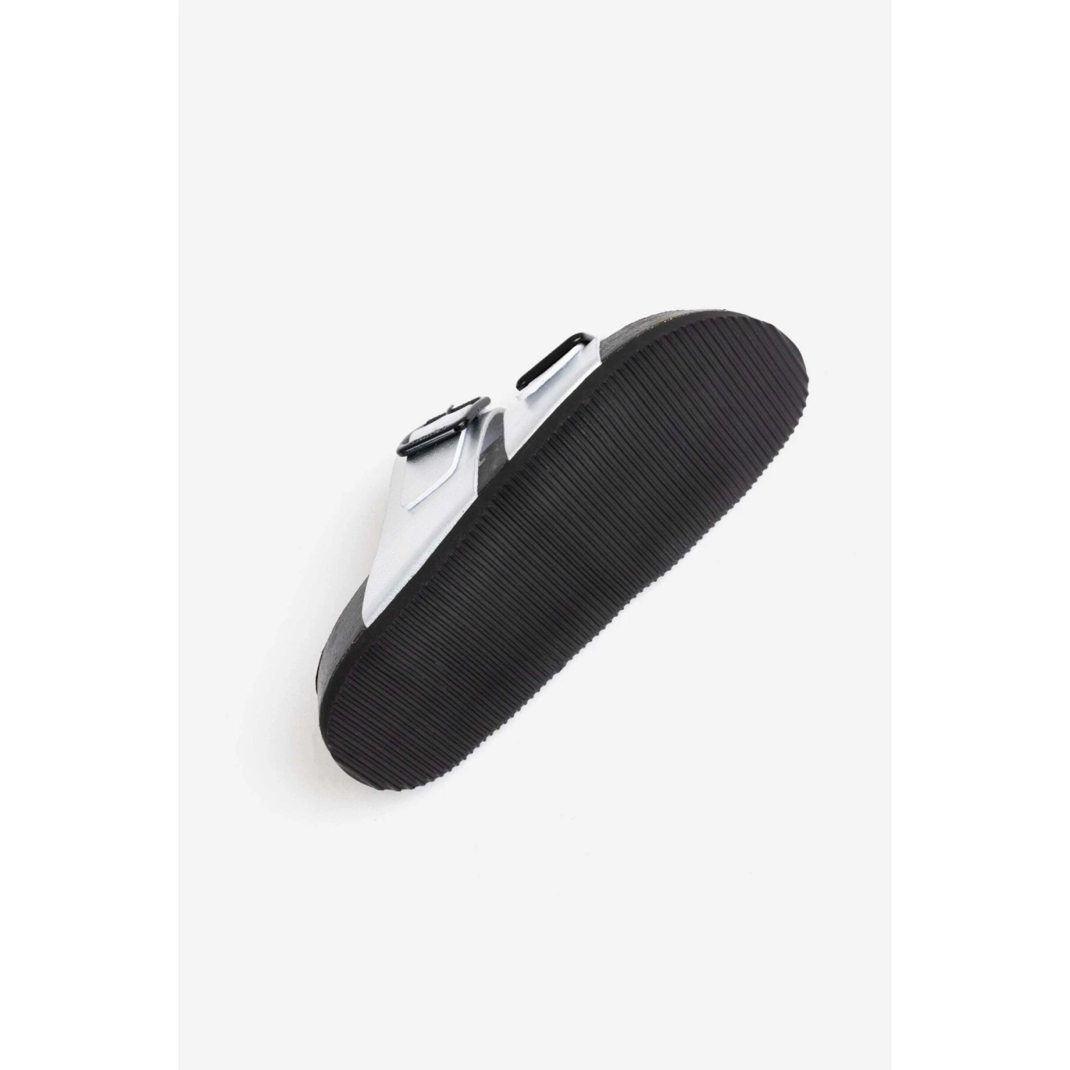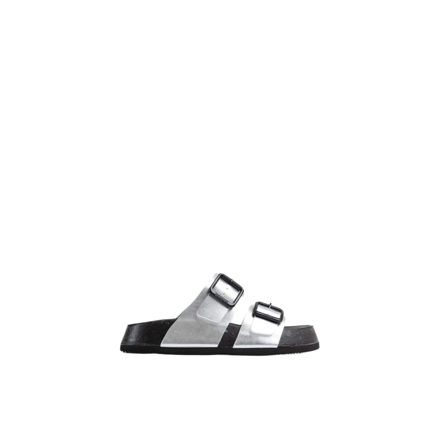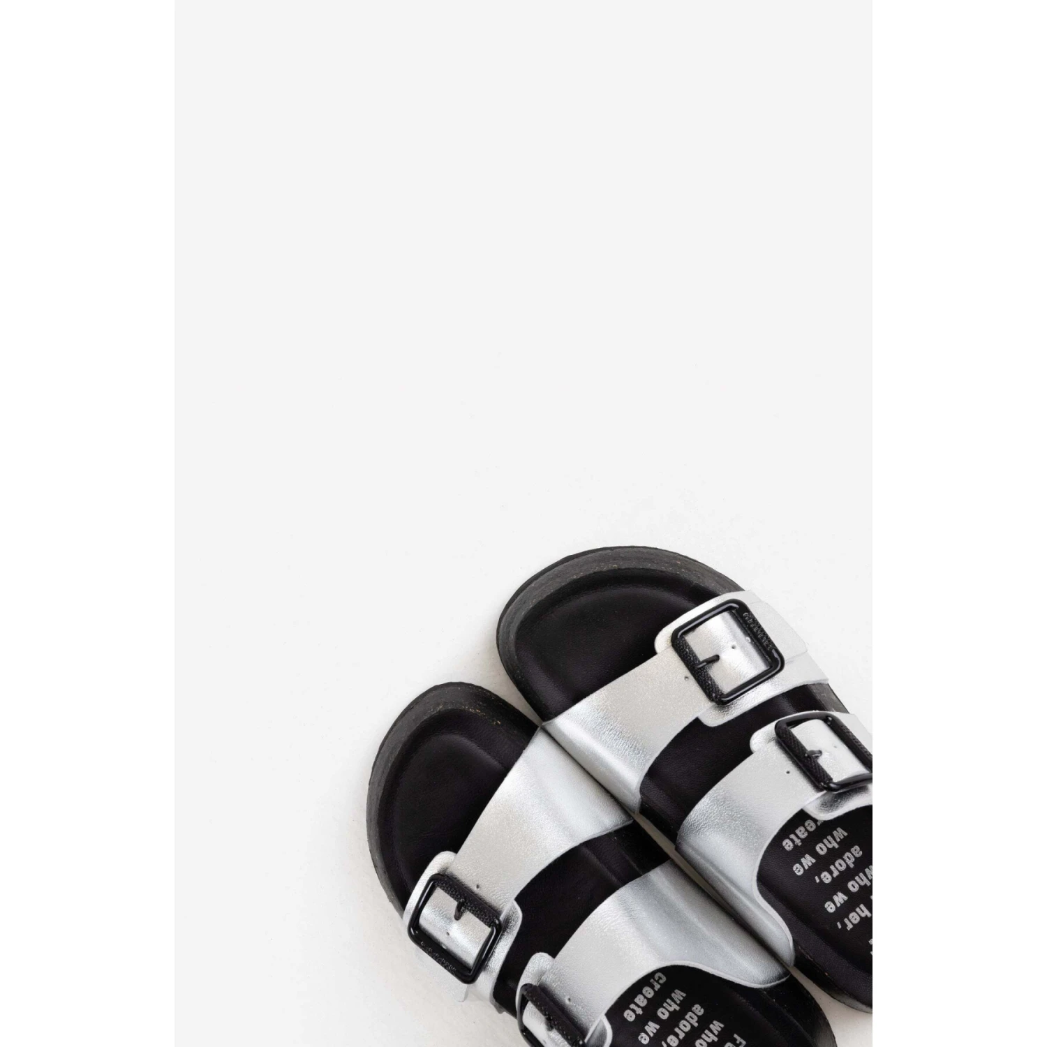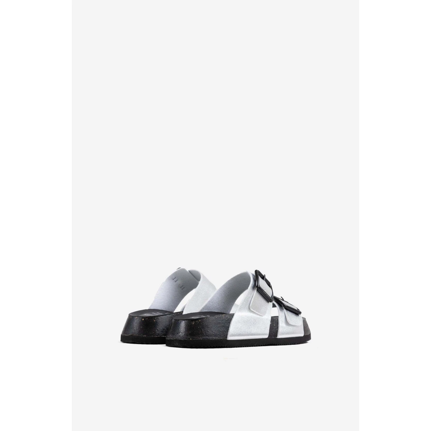 Maak het ultieme modestatement met deze minimalistische slippers. De schuine kurkzool transformeert de traditionele “comfortschoen” in een modeschoen. Samengesteld uit zwart, beige en metallic verheffen deze VERAN-O sandalen elke outfit tot het niveau van mode.