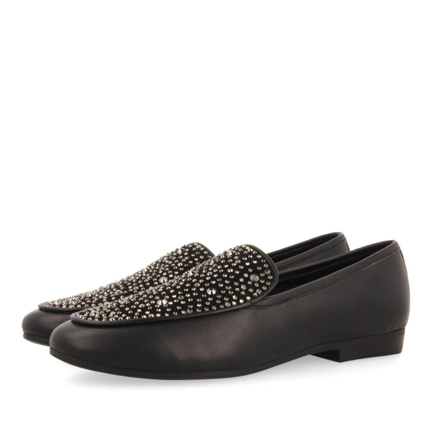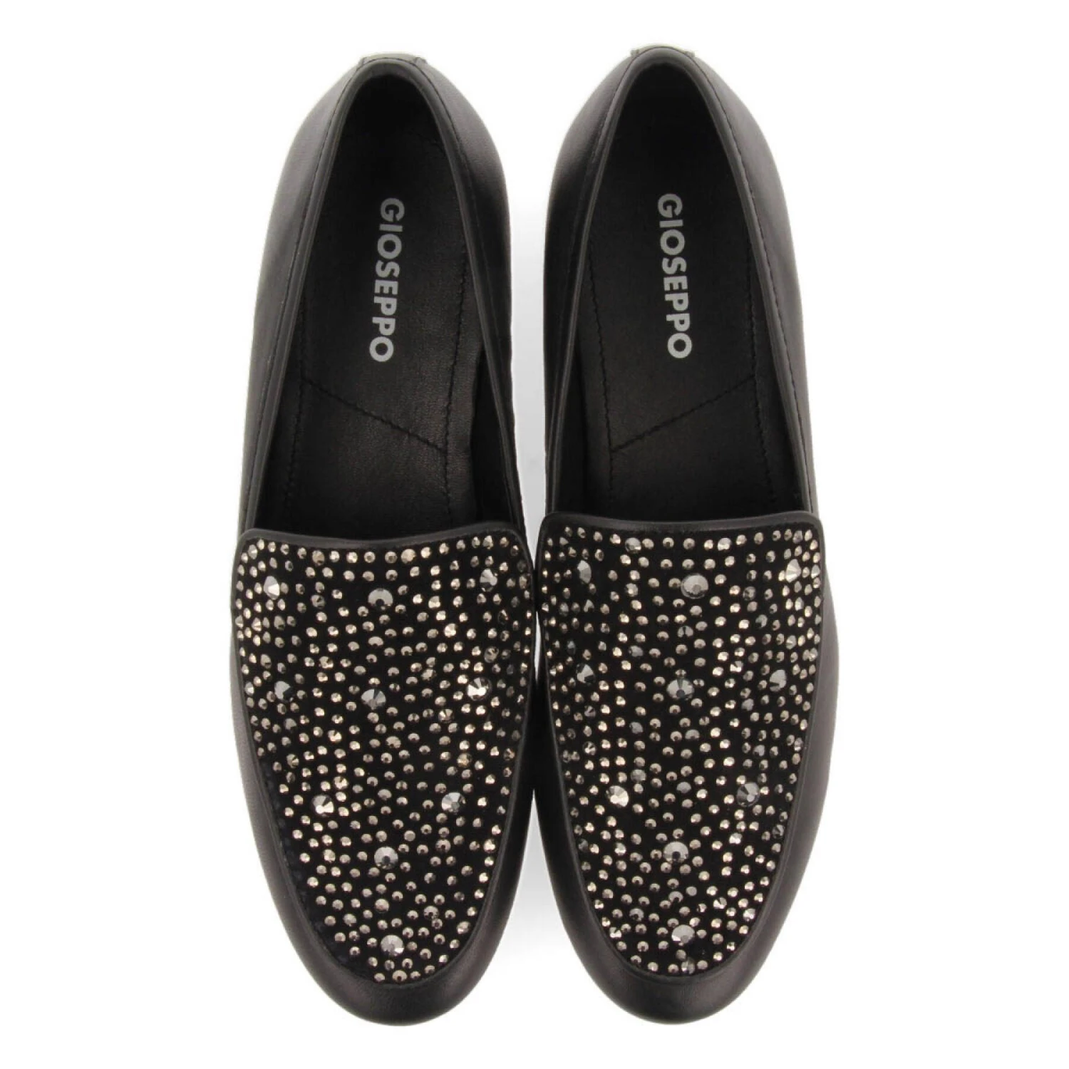 Een van de meest comfortabele modellen van het seizoen. Zwart leren loafers met strass-steentjes. Bovenwerk, binnenzool en voering van leer dat is geproduceerd met behulp van een duurzamer looiproces dat voldoet aan de normen van de Leather Working Group. Sterk gepolsterde latex binnenzool voor extra comfort. Flexibele zolen. Mis de nieuwe reeks mocassins in de Gioseppo Woman FW23 collectie niet.