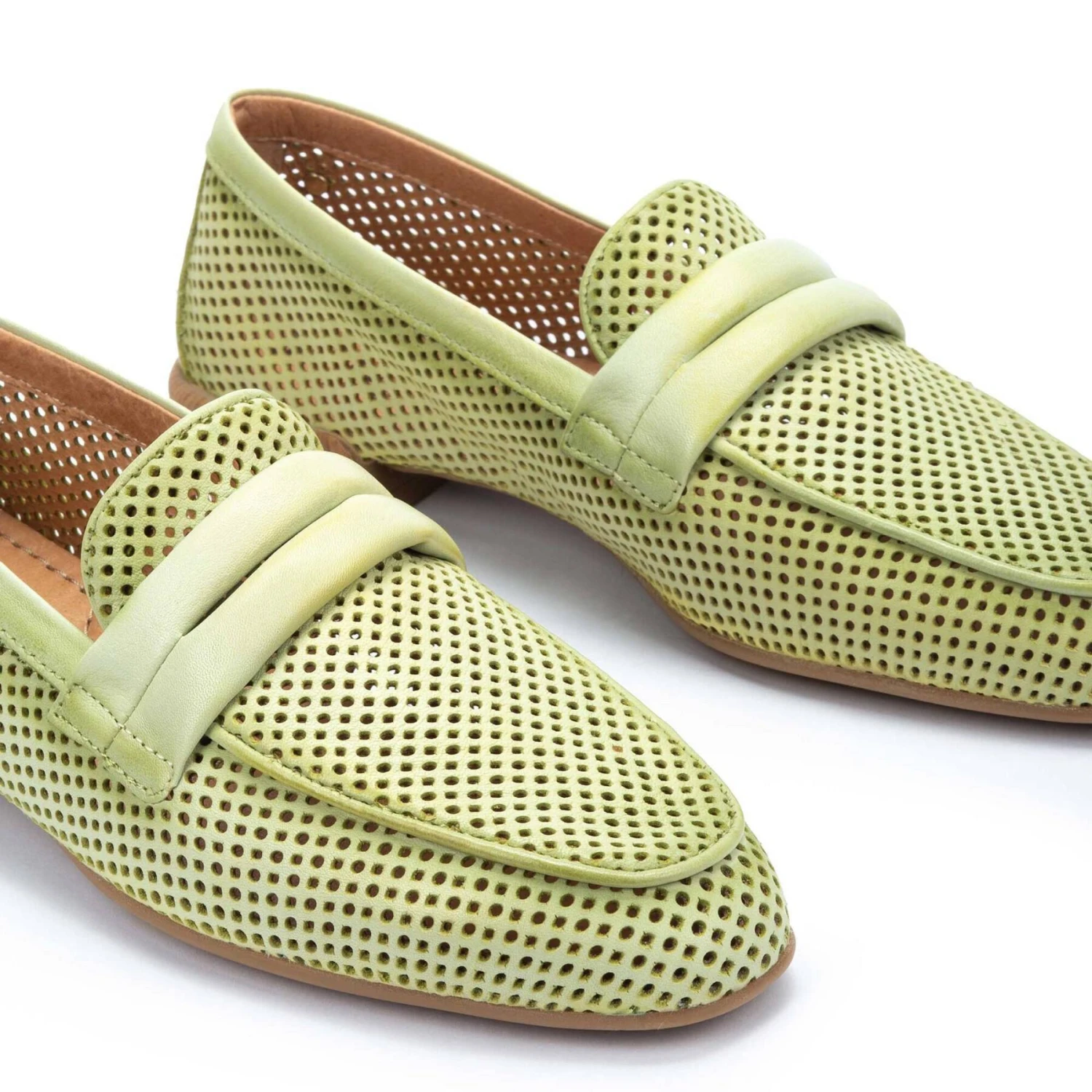 Een lijn van zeer vrouwelijke geklede schoenen die spelen met leer met textuur.