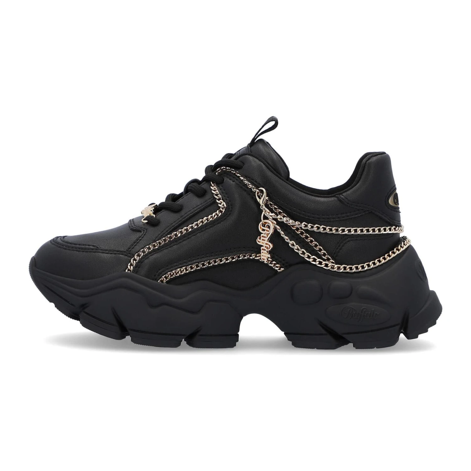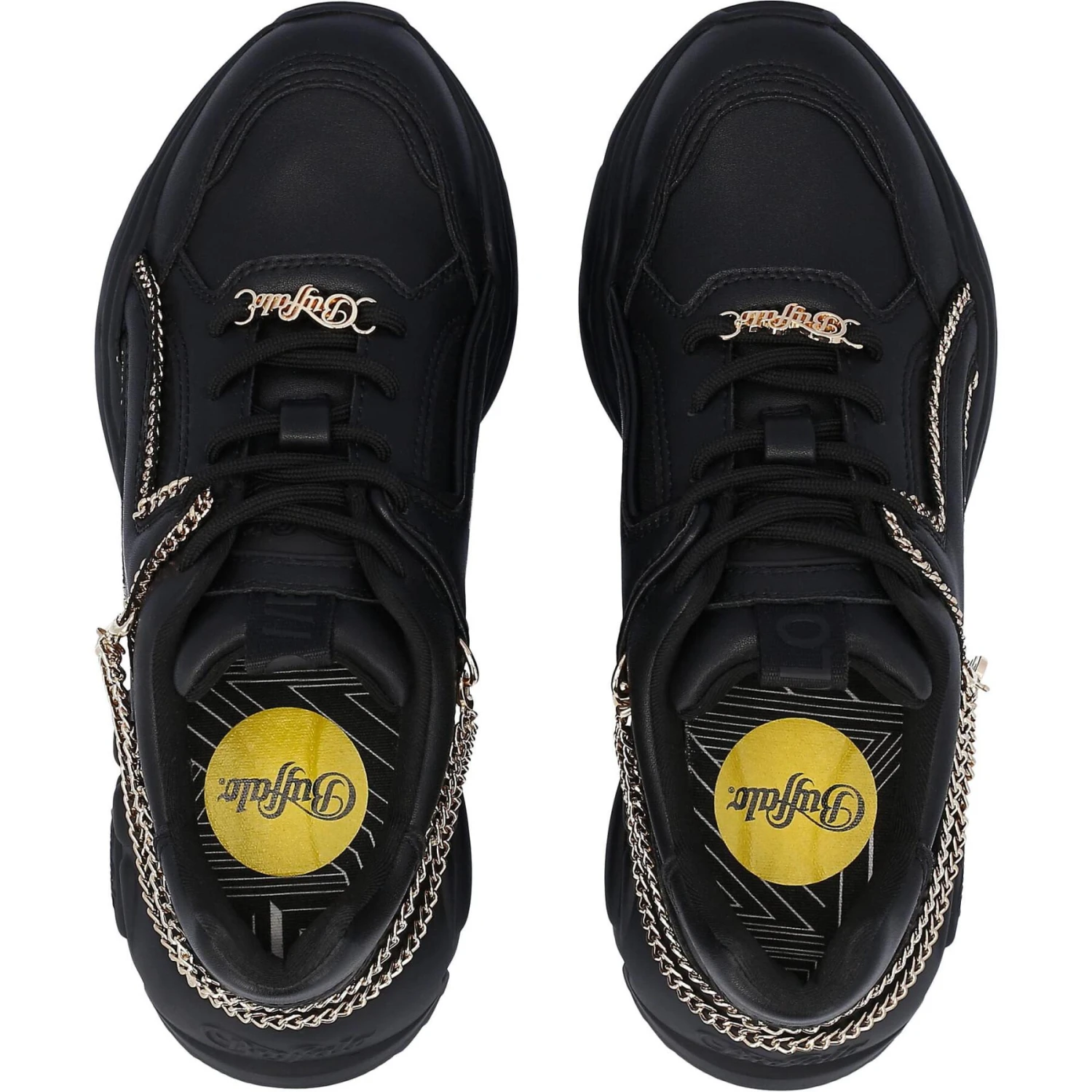 Hou je van voetkettingen? Met de Binary Chain 2.0 trainers, kun je kettingen op je schoenen dragen! Het is een leuke afwisseling van enkel kettingen. Een ultra stijlvolle gouden ketting siert het monochroom zwarte bovenwerk en maakt het af. Hierdoor vallen deze dikke sportschoenen op tussen de massa. Het zachte en ademende nylon materiaal zorgt voor extreem comfort.Kenmerken:Zwart nappa kunstleerVegan en op waterbasis ontworpenGouden ketting detailGegolfde plateauzoolVerwijderbare memory foam binnenzool