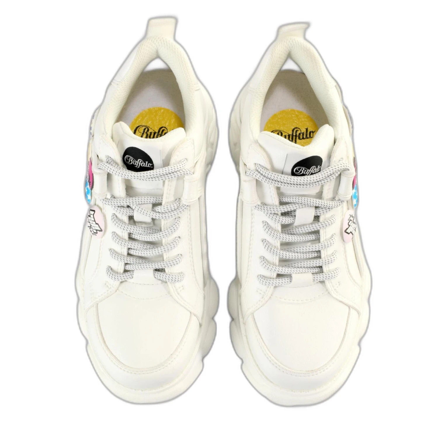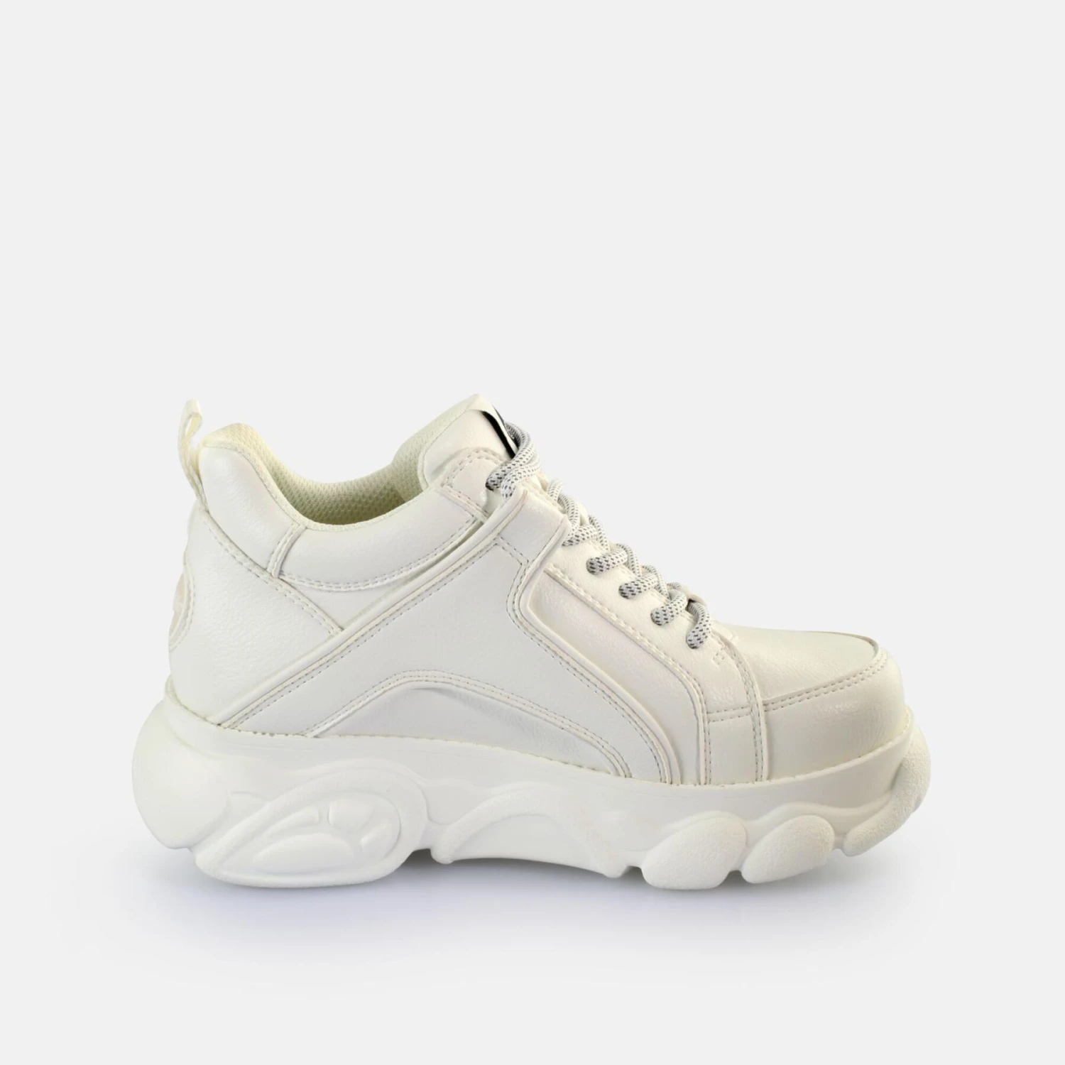 De low-top trainers CLD Corin Button hebben een fascinerend nieuw ontwerp. Talloze knopen geven deze vegan witte sneakers een festivalgevoel. Met hun ultralichtgewicht en dikke wolkenzool katapulteren deze schoenen je naar de zevende hemel! Dankzij hun verwijderbare memory foam binnenzool zijn deze enkellaarsjes ultra-confrtables.