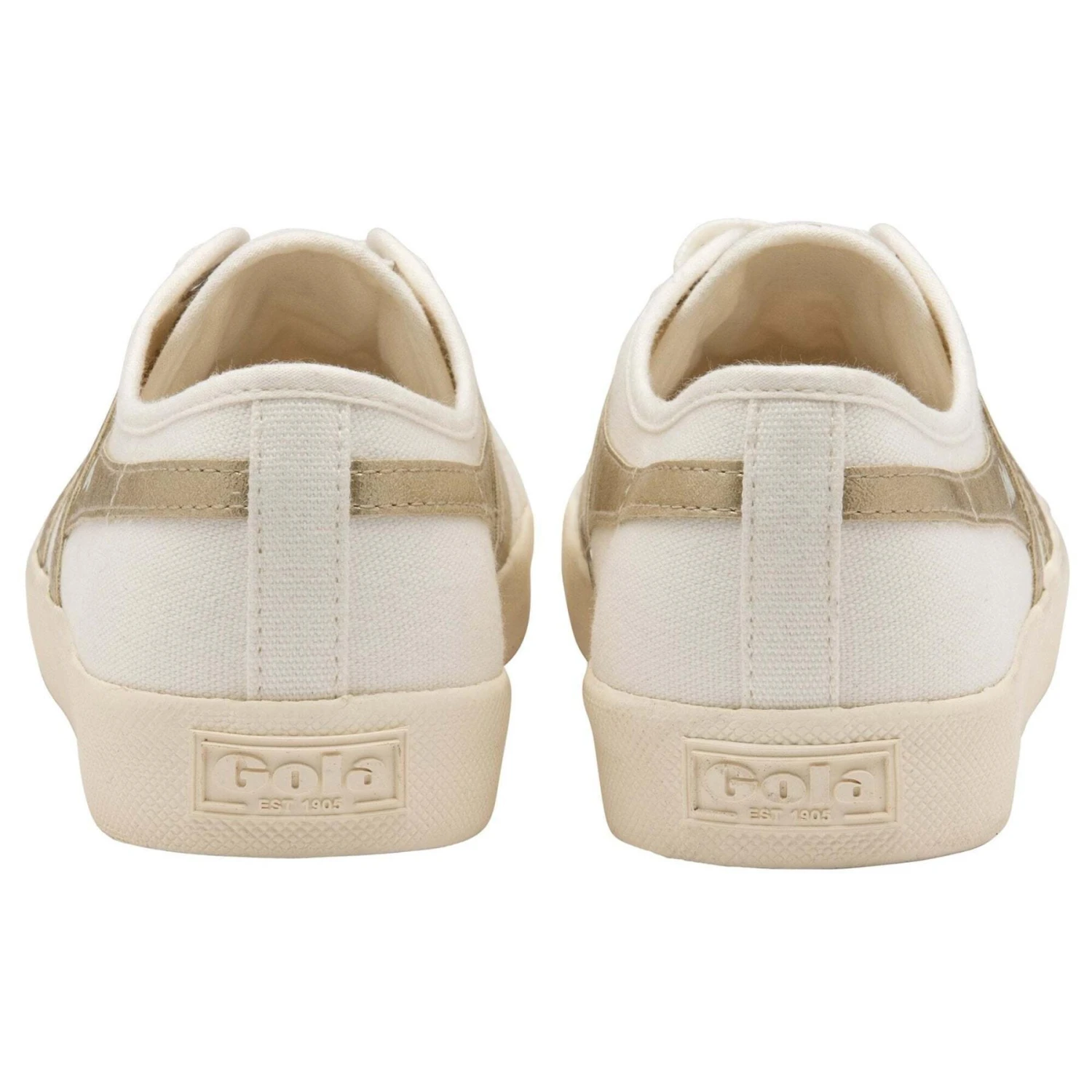 De iconische Coaster krijgt een metallic twist met de damesversie Coaster Flame. Dit iconische silhouet, gelanceerd oporigine in 1976, heeft een bovenwerk van gebroken wit canvas, gecontrasteerd met een goudkleurige Gola wingflash afwerking. Het gouden Gola merk staat ook op de tong. De autres is voorzien van metalen oogjes, een rubberen neus en een buitenzool van echt rubber. De Coaster Flame is een ideale sneaker voor casual looks.