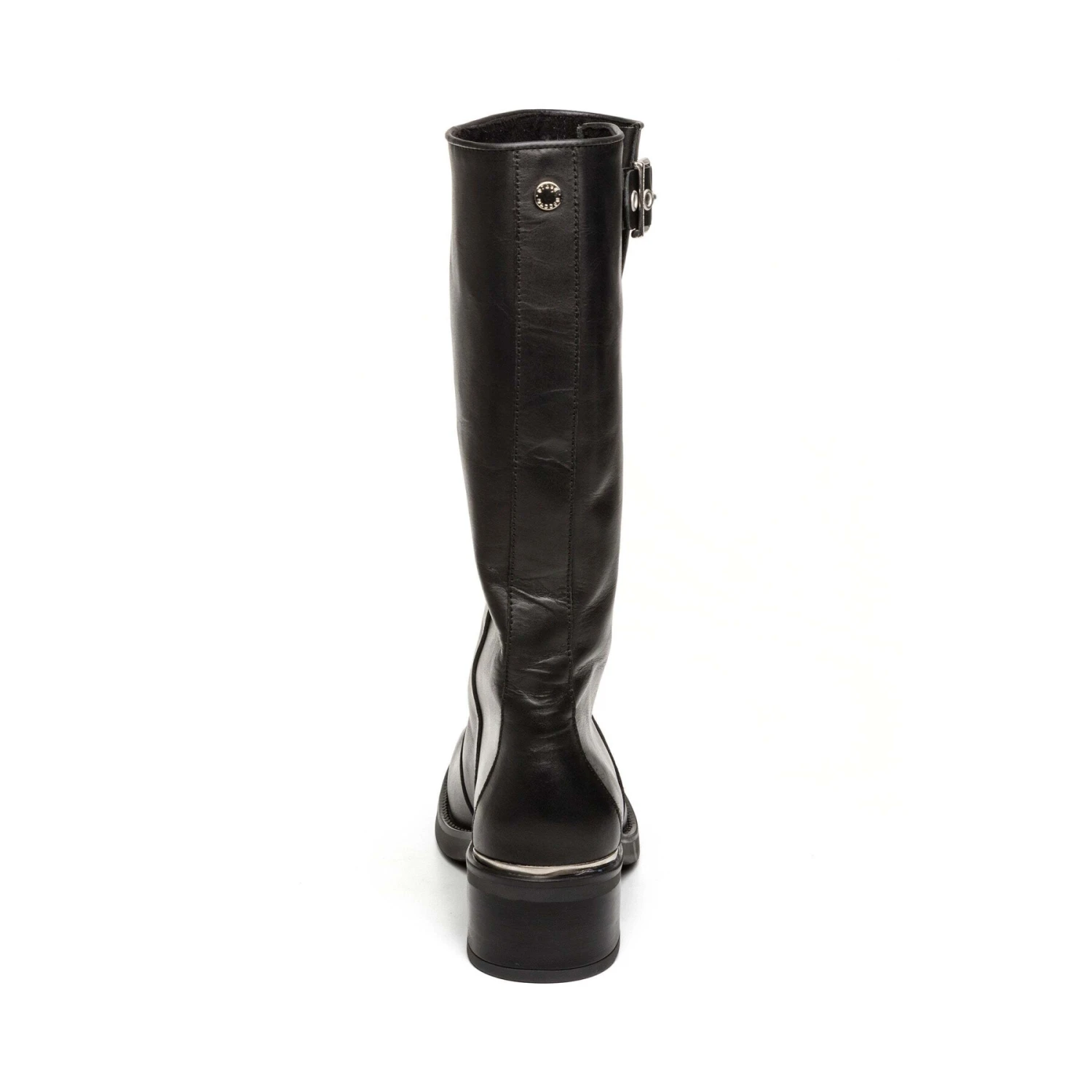 De BONNA-laars met vierkante teen heeft een gestroomlijnd silhouet, versterkt door riemaccenten en een stevige houten zool. Bandjes met gespen en stevige hardware. Een brede zool met blokhak vormt een stevige basis voor deze op techniek geïnspireerde stijl.